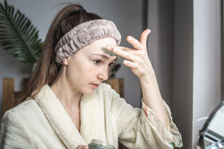 Young pretty woman in a bathrobe in front of a mirror is applying a green cosmetic mask to her face. Concept of skin care, the use of natural cosmetics and lifestyle.
