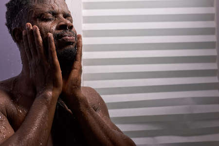 close-up photo of young afro american man washing face in shower, hygiene and bodycare, skincare concept