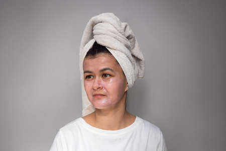 Attractive woman with pink face mask and towel on head. Face skin care and spa at home concept