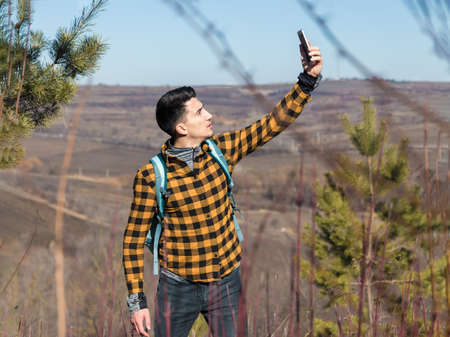 young man in casual clothes lost into the wild trying to catch signal on the phone