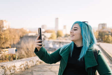 Young Hispanic and transgender girl taking a selfie with her mobile phone. Concept of transsexuality, inclusion and diversity.