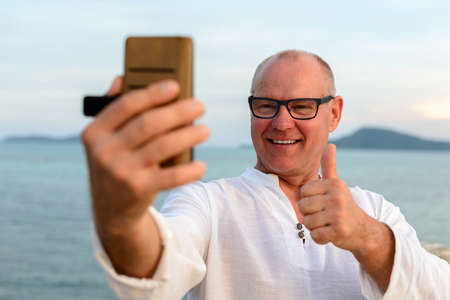 Happy unshaven man smiling while taking selfie on mobile phone at beach
