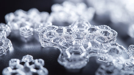 Close up of crystal snowflakes on black background. Shallow depth of field