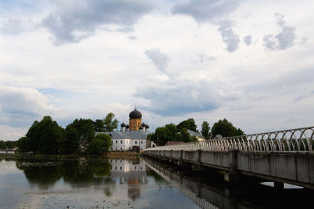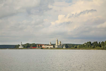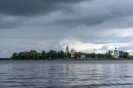Picturesque view of Nilo Stolobensky Monastery on Lake Seliger, Tver region, Russia. Panoramic view of Nilo Stolobensky Monastery, Tver region, Russia