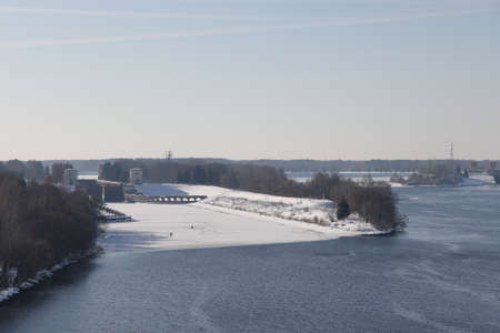 river on a sunny evening. Trees and shrubs. Landscape of winter nature, river banks overgrown with bushes