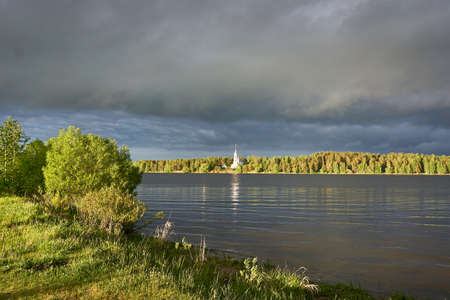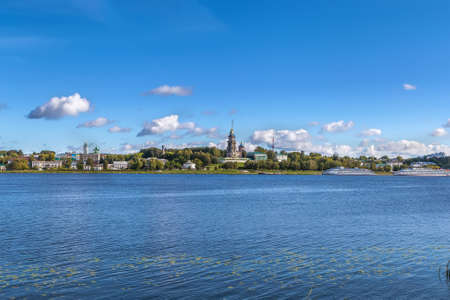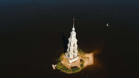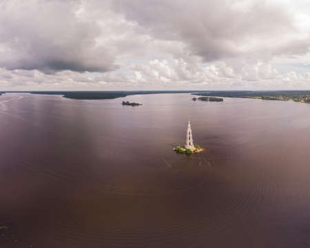 Magnificent panorama from a high point on the Volga river and the Kalyazinsky bell tower of St. Nicholas Cathedral in the water (flooded bell tower). Kalyazin, Tverregion, Russia