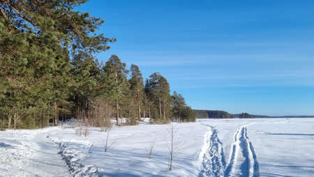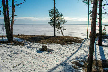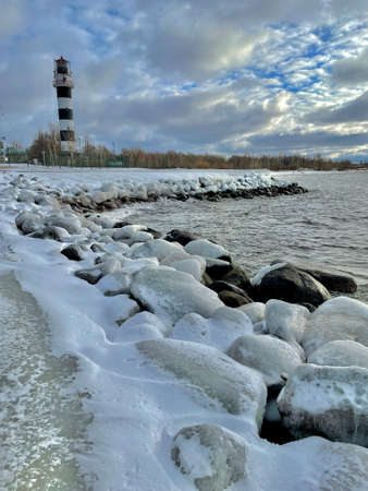The Baltic seashore covered with ice and snow, frozen water and trees on beach of Gulf of Finland, the Sosnoviy Bor, Russia