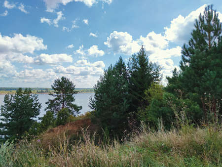 trees at the top of the slope against the background of the river and blue sky with clouds on a sunny day