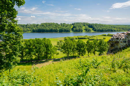 green meadow on the top of the slope near the river on a background of trees and blue sky with clouds on a sunny day