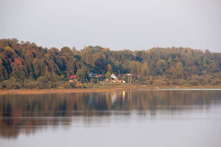 Beautiful autumn panorama of the Volga in a quiet overcast day.