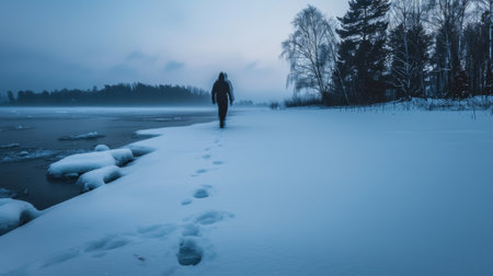 A blurry figure streaking across the frozen lake leaving behind a trail of footprints in the snow