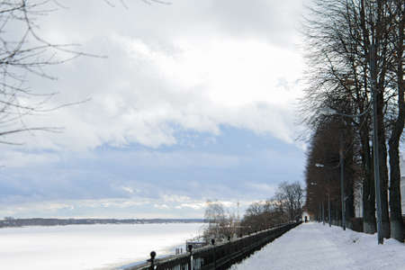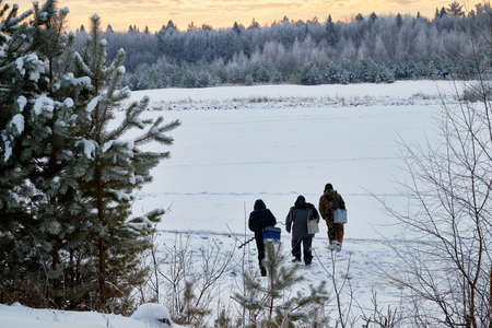 Kirov, Russia - December 15, 2018: Fisherman on the ice of the river on a winter day, morning or evening. View of the river or lake under the snow with a fisherman in a warm dress