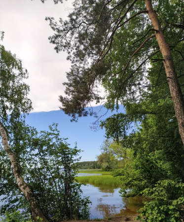 Pine trees on the shore of a forest lake. Summer day and green needles by the water
