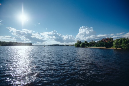 Bright summer landscape with beautiful lake and blue sky with clouds.