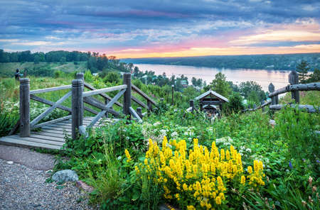 View of the Volga River under a beautiful sunset sky from Mount Levitan in Plyos on a summer evening