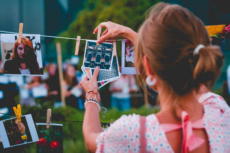 Ukraine, April 11, 2011: The girl hangs photos on a rope. Photo exhibition.
