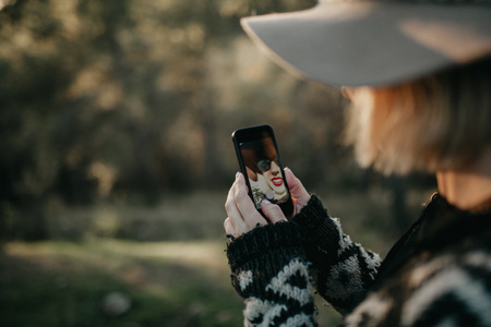 Woman taking a photo with a mobile phone in nature. She appears in the screen through the device frontal camera.