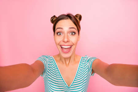 Self-portrait of her she nice-looking lovely lovable shine adorable feminine pretty charming cute cheerful cheery positive girl having fun time isolated over pink pastel background