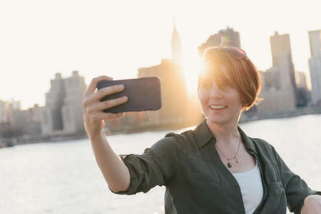 Mid adult woman by waterfront, taking self portrait, using smartphone