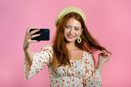 Cute caucasian woman wearing summer dress on city park, outdoors taking horizontal photo with her smart phone.