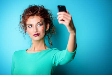Beautiful red-haired girl in sunglasses over blue background making selfie on her cell phone. Beauty, fashion concept. Make-up and cosmetics. Studio shot.