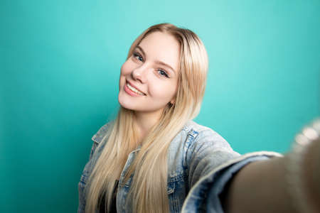 Romantic cheerful blond-haired woman taking selfie looking at phone camera isolated on sky blue background