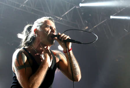 Padua Padova, PD, Italy - March 29, 2017: Piero Pelù the vocalist of Litfiba an Italian Rock Band on the stage during the live concert at Padua in Italy