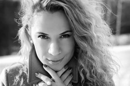 Outdoors portrait of young curly blonde woman closeup. Beautiful girl smiling and looking at camera. Black and white.