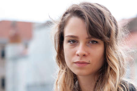 Portrait of a beautiful young girl outdoors. Outdoors portrait of beautiful young brunette woman looking at camera.