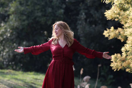 Beautiful portrait of redhead girl standing outside in warm sunny day