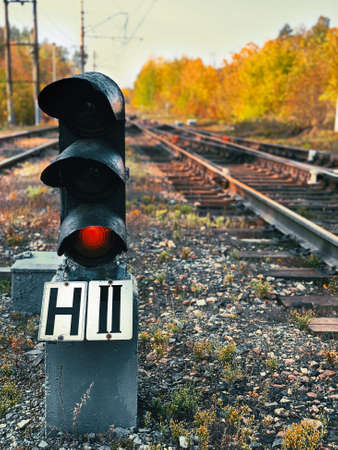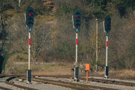 Three central european or slovenian style train signals showing red light on a small branch train line.