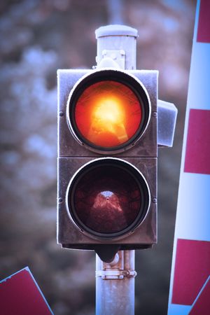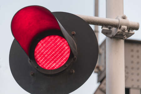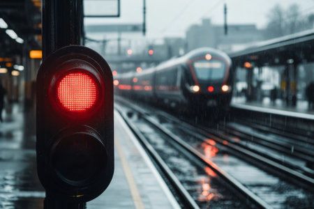 Red light traffic signal in focus with a modern train visible in the background. Urban transportation and railway safety concept