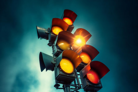 A close-up view presents a traffic signal displaying red, green, and yellow lights. The colors of the lights contrast against a blurred city background. The image exhibits high contrast and bokeh effects. Suitable for illustrating transportation, urban infrastructure, or safety concepts for various purposes.