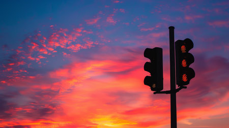 A traffic light silhouette against a vibrant sunset sky, symbolizing the transition from day to night and the changing rhythms of city life.