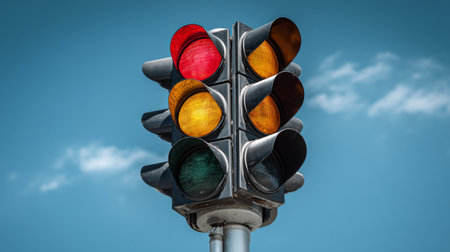 A traffic light stands tall with red, yellow, and green lights, set against a vibrant blue sky dotted with clouds, symbolizing road safety and traffic management.