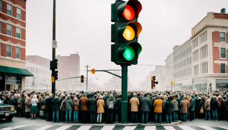 A dense crowd of people waits to cross the street under foggy weather, with traffic lights showing all three colors in a cityscape.. AI Generation