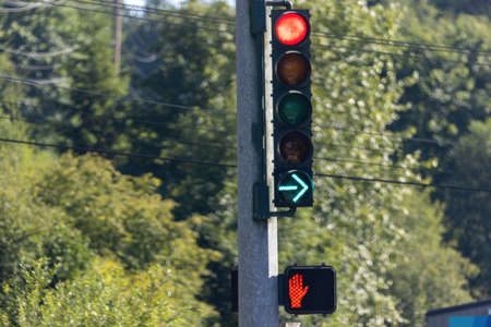 Red traffic light for vehicles on a street in New York, USA. Traffic light with a red arrow indicating the obligation to stop if turning left in the Harlem neighborhood.