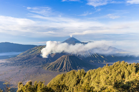 Early morning after sunrise view of the spectacular Gunung Bromo and Sumeru volcanoes in Java, Indonesia