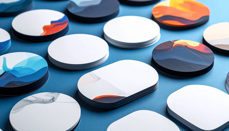 A vibrant collection of blank and artistically patterned round and rounded rectangular cards are displayed on a blue surface.