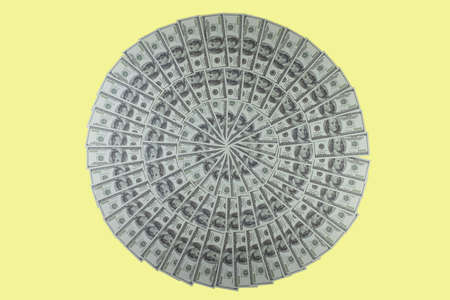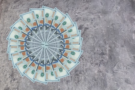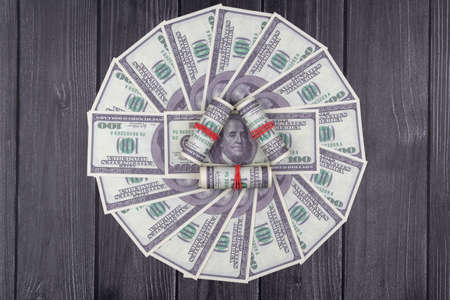 Financial, wealth, business or success concept with 100 US dollar bills fanned in a circle with rolls of banknotes on top over a wooden background. Flat lay, top view