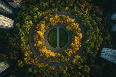 This stunning aerial view captures a roundabout embraced by vibrant autumn foliage, creating an engaging contrast with urban structures. The scene combines nature and city life seamlessly.