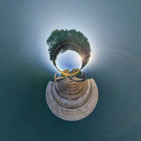 Abstract inversion of little planet transformation of spherical panorama 360 degrees. Spherical abstract aerial view on wooden pier near lake. Curvature of space.