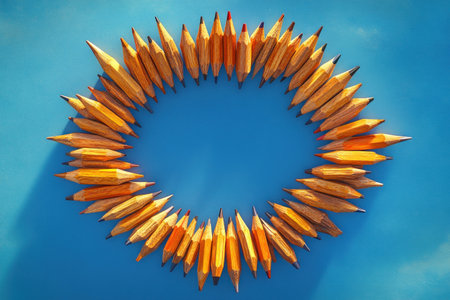 A collection of pencils is artfully grouped to form an oval, showing their colorful tips against a vibrant blue backdrop.