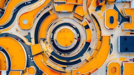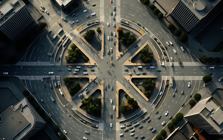 top view of a roundabout in the middle of a busy city. aerial view centered symmetrical.