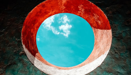 A circular window in a textured wall, showcasing a vibrant blue sky with wispy white clouds.