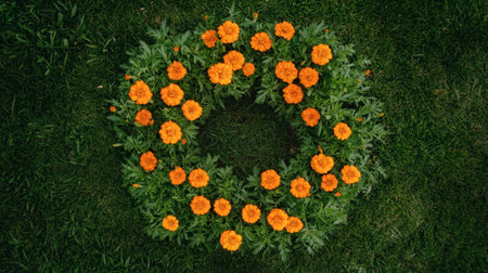 A stunning circular arrangement of orange marigolds set against lush green grass. This vibrant floral display captures the essence of nature's beauty and freshness.