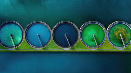 A stunning aerial view showcasing circular tanks filled with water, displaying vibrant hues of blue and green. This abstract landscape highlights natural patterns and textures.