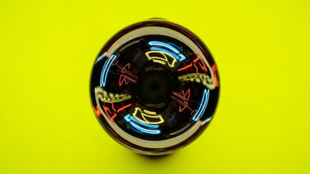 A striking abstract a highly reflective, dark sphere positioned against a vibrant, solid yellow background. The surface of the sphere acts like a mirror, capturing and distorting colorful neon lights. These lights, primarily in shades of blue, red, and yellow, form intricate, circular patterns and geometric shapes within the reflection. The contrast between the smooth, dark sphere and the bright, dynamic reflections creates a visually engaging and futuristic aesthetic. The close-up...
