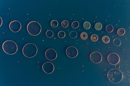 Fish farm with floating cages in Chalkidiki, Greece. Aerial view