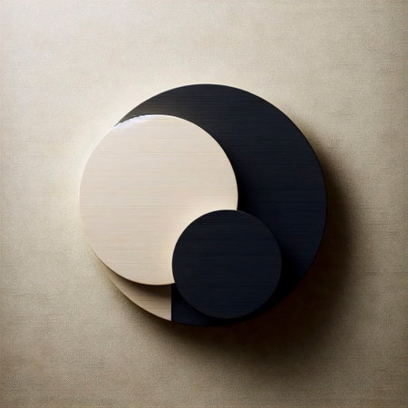 Circular artwork features a striking division of orange and teal colors, showing modern design in a bright and minimalist setting.